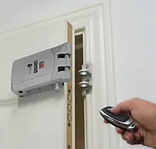 Mal llamada cerradura, es más bien un cerrojo, que actúa de forma electrónica. Por tanto, no va incrustado en la puerta como lo haría una cerradura o una doble cerradura, sino que va superpuesta por la parte interior, generalmente con tornillería especial. Se acciona con un mando a distancia, al estilo de los de los garajes, con dos botones, uno de apertura y otro de cierre. Al apretarlo, se desplazan las patillas interiores de la cerradura, saliendo y anclándose al otro lado de la pared, si quieren cerrarla, o subiendo y metiéndose en la cerradura, si quieren abrirla.
